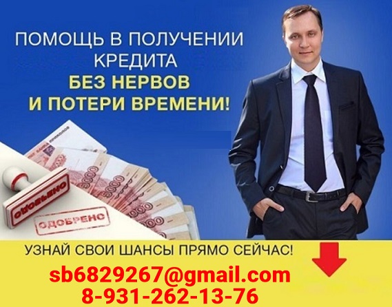 Профессиональная помощь в ситуациях любой сложности. Окажем помощь в получении кредита c действующими просрочками и испорченной кредитной историей. Работаем без посредников на законных основаниях. Предоставляем гарантии! Наши услуги распространяются на граждан старше 18 лет, проживающих на территории страны. Работаем практически в каждом регионе. У нас нет комиссий и предварительных вложений в любом их проявлении. До 5 млн. рублей на максимальный срок 10 лет, с возможностью досрочного погашения. Связаться с нами Вы можете по эл. почте и контактному телефону 8-931-262-13-76